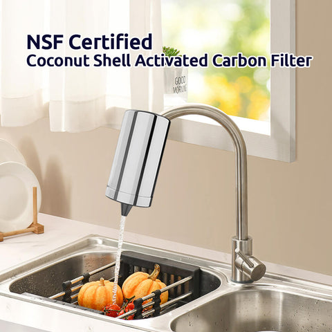 AFaucet 1 Faucet Water Filter uses the most advanced activated carbon block filtration technology, filter meets NSF/ANSI 42&53 standard, effectively filters sand, dirt, rust, chlorine, lead and other impurities in the water, to improve the taste and absorb the peculiar smell of water, and provides you with the cleanest and healthy drinking water.