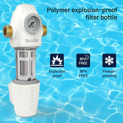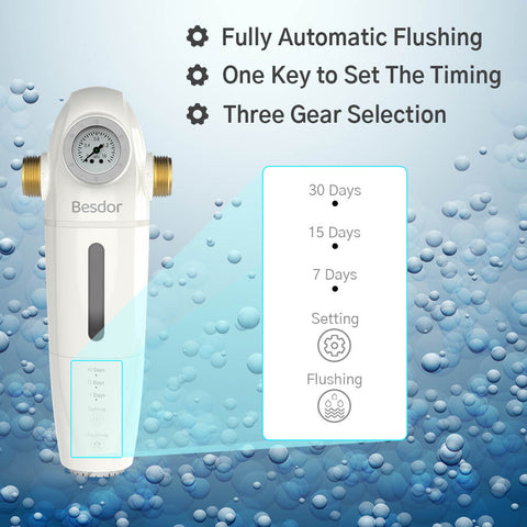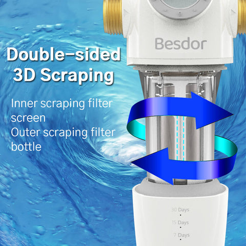 You can set the backwash periods, there are 3 levels available, which frees your hands and installation position will not affect the cleaning. Double-sided 360-degree scraping cleaning, inner scraping filter screen, outer scraping filter bottle. Pay attention to automatic backwash needs 3 AAA batteries (not included in the package).